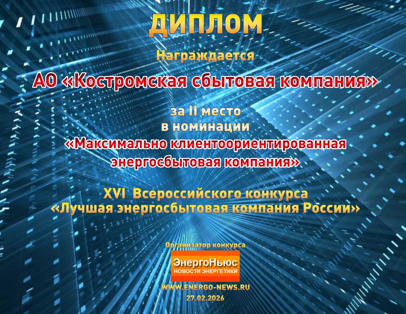 27 февраля 2026 г. подведены итоги ХVI Всероссийского конкурса «Лучшая энергосбытовая компания России», организованного редакцией сетевого издания «ЭнергоНьюс». В отраслевом состязании по итогам производственной деятельности в 2025 году приняло участие 42 компании. Борьба за первенство проходила в 4 конкурсных номинациях.